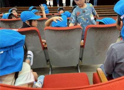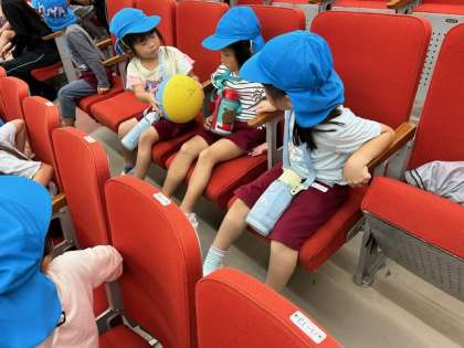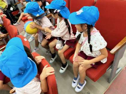 住吉幼稚園出身のお兄さんお姉さんが頑張っている様子を見て「○○君や」「幼稚園にいたな」と懐かしんで言っている子どももいました。そんなお兄さんがクイズの答えを聞きにきてくれたり、ボール回しゲームのボールを渡してくれたりして、小学校が楽しみになったあお組でした。