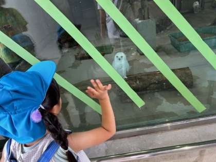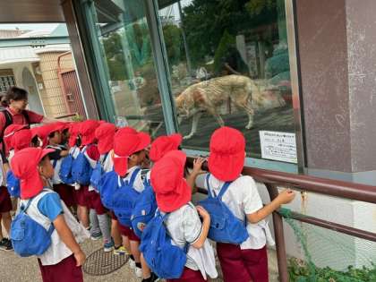 トラ舎にフクロウが住んでいて、近くで見られて、「かわいい」とずっと眺めていました。「ハリーポッターに出てくるフクロウみたいやな」と話している子もいました。オオカミがウロウロ動き回っている様子を楽しげに見ていました。あお組は鳥と話そうと指笛を使って呼びかけていました。