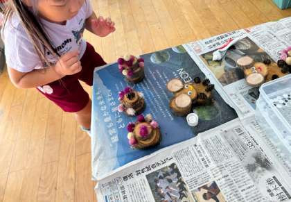 幼稚園の桜を輪切りにしたものや住吉小学校でいただいた千日紅の花などを使って、ケーキや動物を作っていました。夕方、お客さんが来られたときには、大急ぎで玄関にきて、来てくださった3人のお客様に「私がつくった」と嬉しそうに渡していました。「飾るね」と言っていただき、喜んでいました。