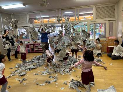 新聞紙をビリビリ破って、保育室にたくさんの新聞紙がたくさんに!雨のように降らせて楽しみました。