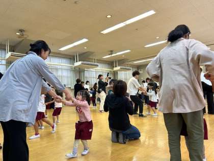 いつも通りのように絵本も借りました。「こんなふうにして絵本借りてるんや」と一緒に絵本を探していました。みんなで集まって100周年記念のダンスもまた踊りました。