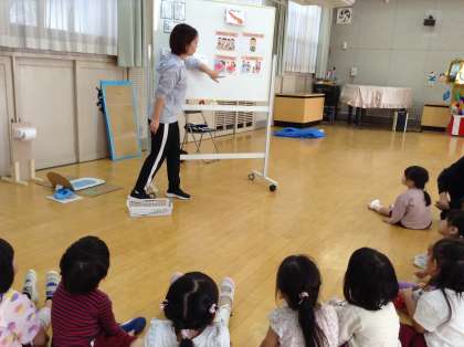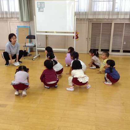 もも組にトイレの保健指導をしました。カエルのポーズをする「ケロケロの術」を覚えると和式トイレを使えるようになることを知らせました。先生カエルの真似をして、もも組カエルさんもみんなでケロケロの術を練習しました。ケロケロの術を習得した子どもたちは、次は和式トイレの模型を使って、練習をしました。和式トイレは怖くて入れない子どもたちもいましたが、練習では、すべての子どもたちが和式トイレを上手に使えました。最後までカエルになりきっていたもも組カエルさんたちは、お話が終わると、「ありがとうございましたケロ!」と挨拶してくれました。