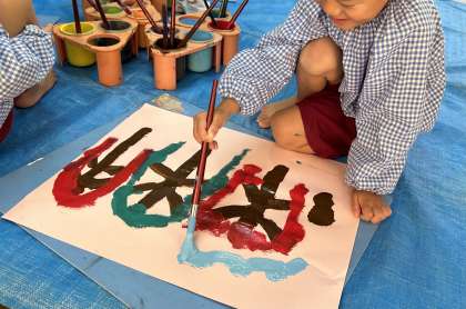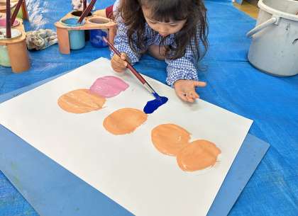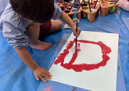 あか組は、園外保育で行った大阪城公園での楽しかった思い出を絵で表現して遊びました。お弁当を食べているところやどんぐり拾いをしているところ、鬼ごっこをしているところなどをかいていて、昨日の園外保育で子どもたちにとってたくさんの楽しい思い出ができたようです。