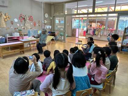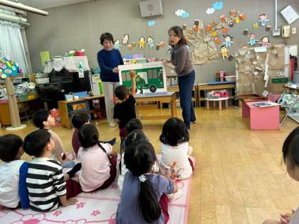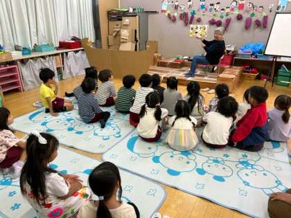 絵本、大型絵本、紙芝居、パネルシアターなど、いろいろなものを持ってきてくださり、引き込まれる話し方で、笑ったり、静かに聞いたり、発言したりして聞いていました。