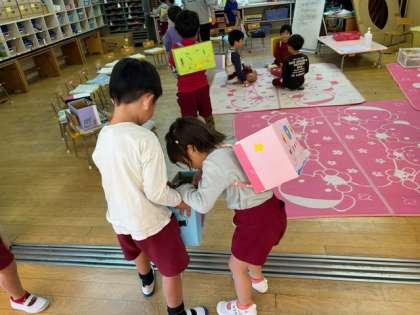 保育室では、リュックサックを作ったり、中に大事なものを詰めて背負って遊んでいます。