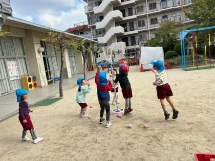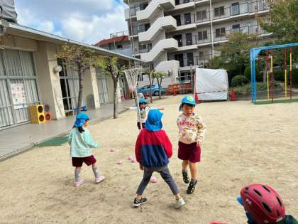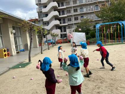 「玉入れしたい」という子どもがいて、玉入れ台を出すと、たくさんの子どもたちが集まってきて、玉入れが始まりました。近くから投げたり、遠くからカゴをねらっていたり、楽しみ方はいろいろありますね。