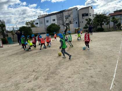 あお組にとっては3年間楽しんできたサッカー遊びの最後の日でした。ボールを追いかけたり、ボールの数を聞いて、友達と集めたり、試合をして、ゴールにシュートしたりして楽しんでいました。