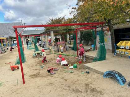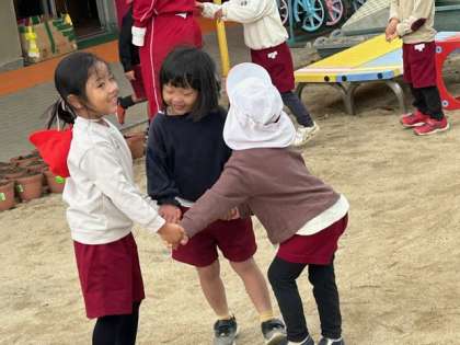 急に寒くなった園庭でしたが、元気いっぱい、砂場で遊んだり、「なべなべ」をしたりしていました。友達と一緒に遊ぶことが大好きなあか組の子どもたちです。
