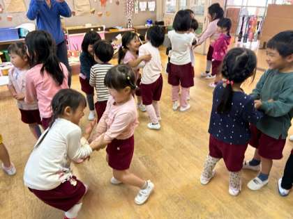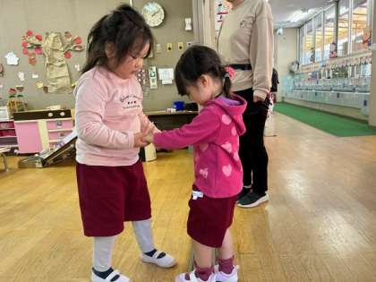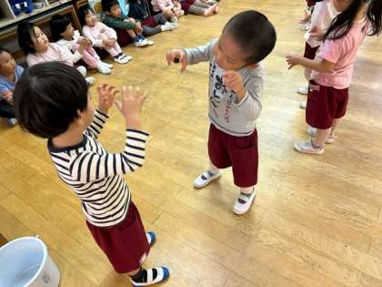 「もみもみもみじ」という曲に合わせて、異学年の友達と仲良し遊びをしました。自分をもみもみしたり、ペアの友達をモミモミしたりして遊びました。
