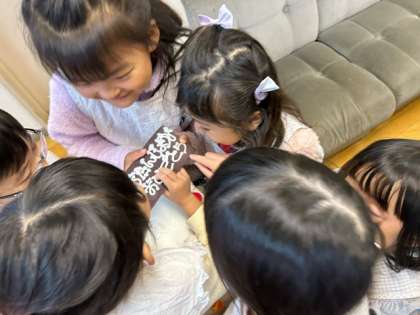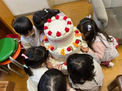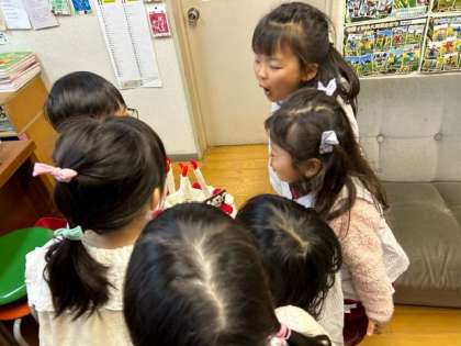 10月、11月生まれの誕生児が園長室に集まり、自己紹介を聞き合ったり、誕生バッチをもらったりしました。友達の自己紹介の応援をして、自己紹介を聞いていました。園長室にある本物に見えるケーキが初めから気になっていて、みんなでロウソクを吹き消したり、チョコレートを食べたり、「みんなで食べようか」と果物を「パクパク」と食べるふりをして、笑い合っていました。