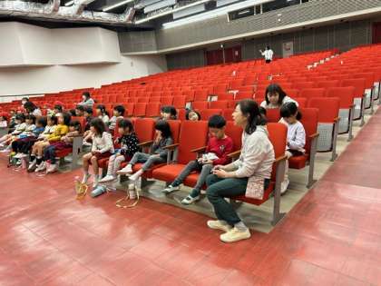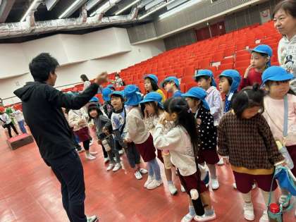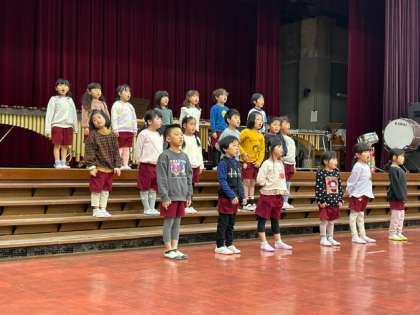 住吉小学校の講堂で、小学校と幼稚園、保育所で音楽交流会をしました。4年生の歌や楽器演奏、保育所の友達の歌を聞かせていただきました。あお組も「どんな色がすき」「むしむしじゃんけん」「いちょうのはっぱ」を歌い、聞いていただきました。小学校の先生にも褒めていただきました。