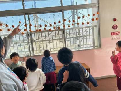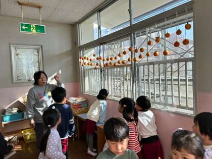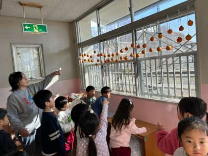 幼稚園でも柿を収穫しましたが、保護者と子どもが渋柿を干し柿にして届けてくれました。