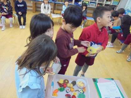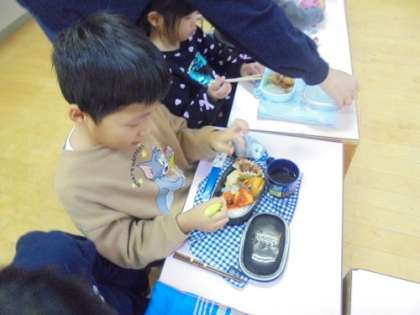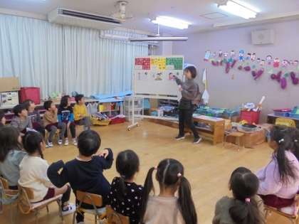 あお組に三色食品群についての保健指導を行いました。赤・黄・緑の「げんきれんじゃー」の仲間をバランスよく食べると、「うるとらすーぱーげんき」になれることを知らせました。保健指導後の昼食の時間には、「げんきれんじゃーがそろってる!」「みどりれんじゃーがいなかった…」と友達同士で言いながら、楽しくお弁当を食べていました。