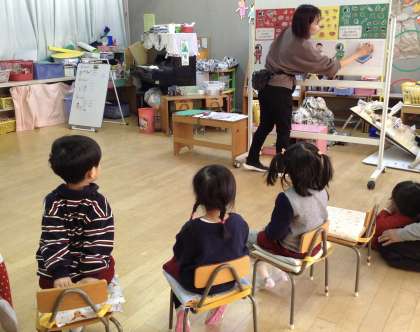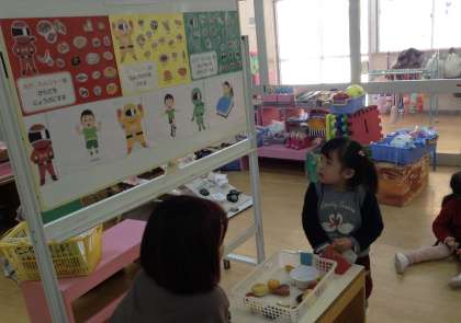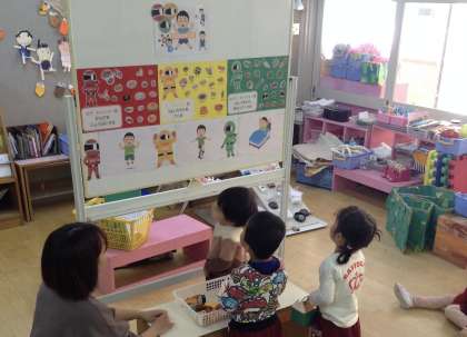 もも組に三色食品群についての保健指導をしました。赤・黄・緑のげんきレンジャーの話をした後、げんきレンジャーの仲間を見ながら、赤・黄・緑の買い物カゴにそれぞれのげんきレンジャーの食べ物を入れてお買い物ごっこをしました。