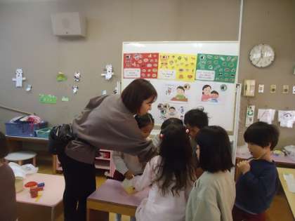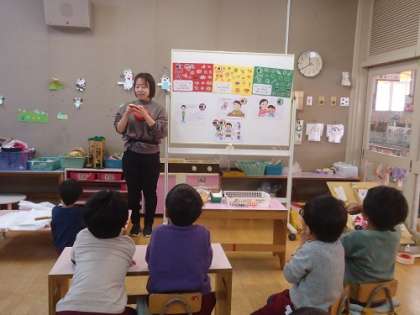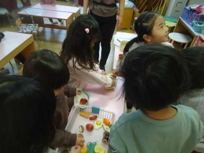 あか組に三色食品群についての保健指導を行いました。3つの色の食べ物を知らせ、それぞれの色の食べ物のお買い物ごっこをしました。友達同士で相談しながら、食べ物を選び、選んだ食べ物を発表して、みんなで答え合わせをしました。みんなよく分かっていて、全員正解していました。保健指導のあとはすぐにお弁当だったので、何色の食べ物が入っているかを確認しながら食べていました。
