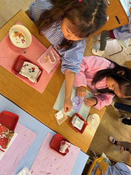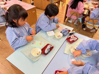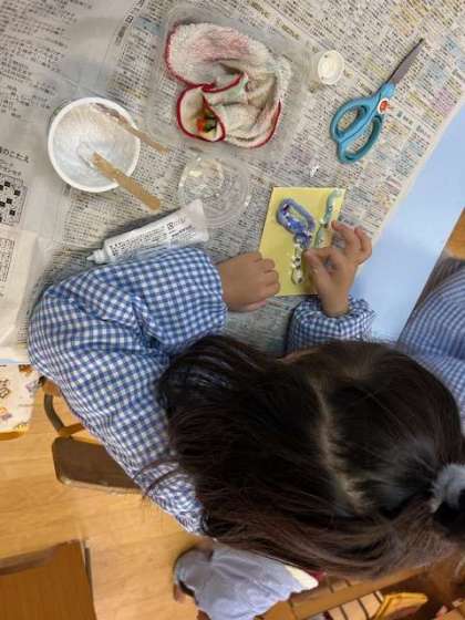 来年の干支のヘビをつくろうと模様のヘビを作っています。「ぼくのヘビ、見て」「きれいな模様ついてる」などと言い、友達と見せ合いっこをしながら、貼っていました。あ