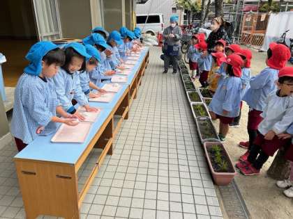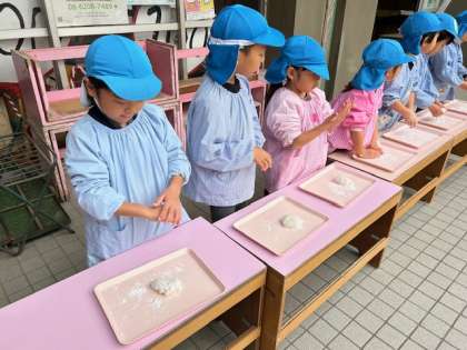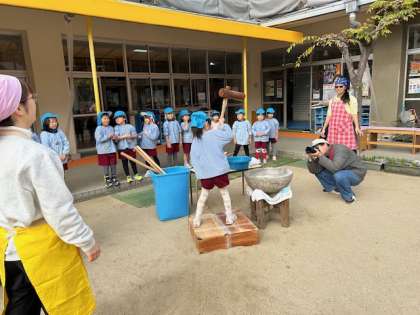 あお組からついていきました。さすが5歳児、力強く、ついていました。自分たちでついたお餅を「ふわふわ」と触ってみたり、ちぎったりして、自分だけの鏡餅を作りました。