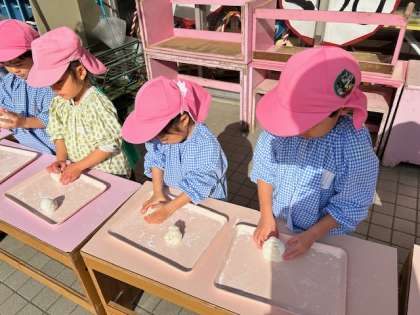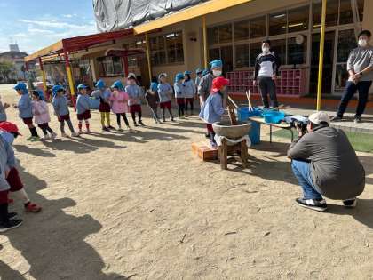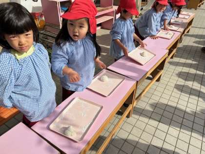 もも組やあか組も重い杵を持ってついたり、出来上がったお餅を丸めて鏡餅にしました。できた鏡餅は粘土で作ったダイダイを乗せて、帰りにおうちの方にも見ていただきました。また始業式に飾りましょう!