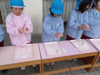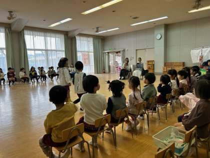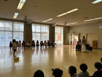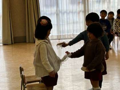あか組の2人の誕生会でした。手をつないで、仲良くスキップで入場してきました。自己紹介の後、お家の方から「大好きよ」と言ってもらって、嬉しそうにはにかんでいました。クラスの友達が作ってくれたプレゼントをもらいました。