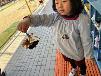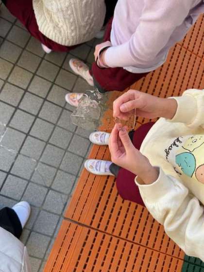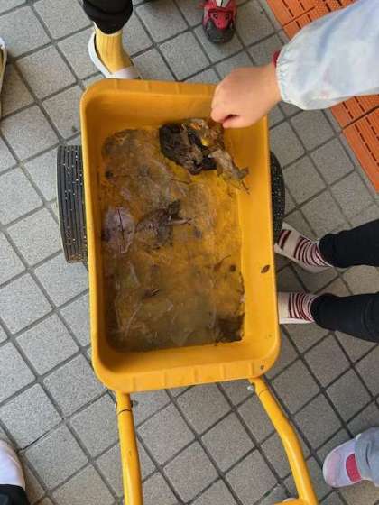 ザリガニ池が凍ってると子どもたちは大騒ぎ。「凍ってた」「葉っぱも一緒に凍ってた」と氷を触っていました。「寒い」と震えながら登園してきた子どもたちでしたが、氷を見て喜んでいました。