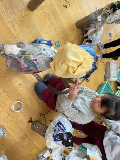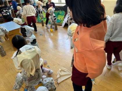 あお組は1人ずつ、世界に一つしかない人形を作っていました。「顔できてきてんな」「髪の毛三つ編みしてる」と言いながら、作っていました。「僕よりちょっと小さいねんな」と笑っていました。