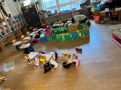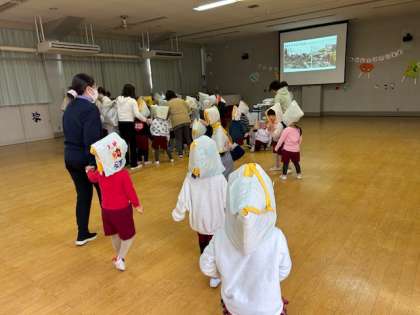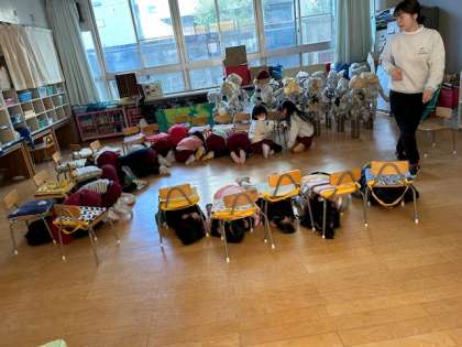 地震の避難訓練を行いました。初めは頭を守り、小さくなって待っていました。先生たちはその間に暖房や電気を切り、避難経路を確保しました。その後防災頭巾を被って、リズム室へ避難することができました。絵本から30年前の阪神淡路大震災の話を交えて、映像も見て、「怖いなあ」と真剣に考えていました。南海トラフ地震が起こる確率が高いと言われているので、お家でも一度子どもたちと避難について話をしてもらいたいと思います。