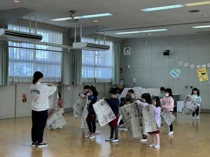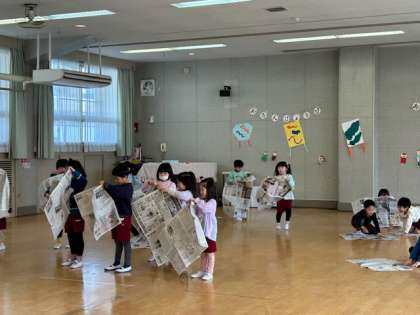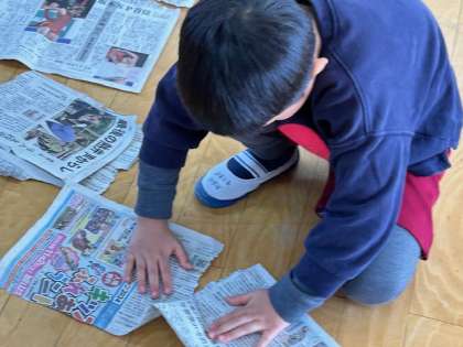新聞きれいに破れるかなと、丁寧に破っていきました。長い紙になるように破って、少しずつつなげることにしました。