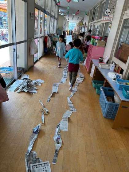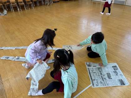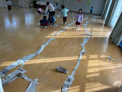 破った新聞紙をつなげていくと、どんどんと長い道になっていきました。リズム室から伸びていき、道は廊下を通って保育室を通り過ぎていきました。途中で曲がって分かれ道も作っていきました。