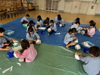 昨日につくった新聞紙の張子を見て、「固くなってる」と驚いた様子のあお組。今日は白い奉書紙をちぎって、次は新聞紙が見えないように全面に貼りました。「