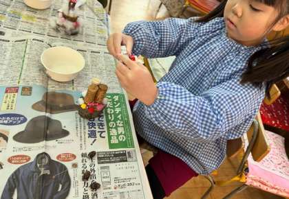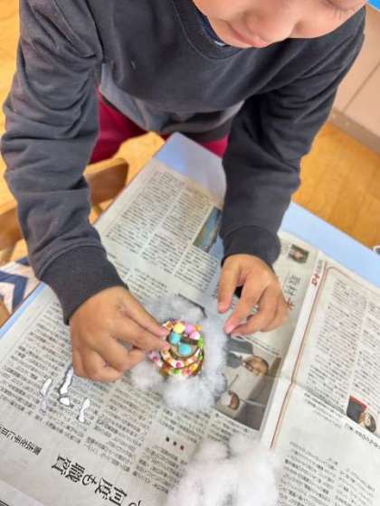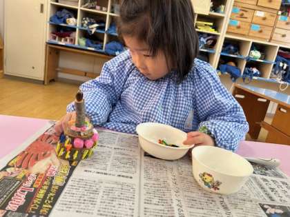 「もうすぐ幼稚園が100歳だからケーキ作る」「美味しそうやろ」「あげないけど、見に来て」「食べられへんよ」とにこにこしながら保育室に呼んでくれました。自信をもって、できたことを喜んでいる子どもたちでした。