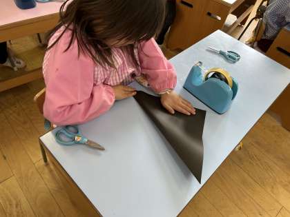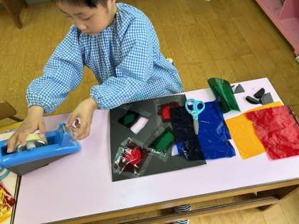 大好きな切り紙を、今日は画用紙でするということで、ワクワクした気持ちで、先生の話を聞いていたあお組。いつものように細かい切り込みをたくさんではなくて、セロハンを貼ることを考えながら切り紙をして、どの色をつけようかと悩みながら作っていました。だんだんとセロハンを通して見る周りの様子も楽しみながら、作っていました。