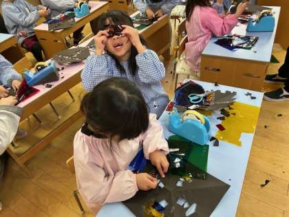 作ったり遊んだりしながら、少しずつステンドグラスになっていきました。セロハンの特性も知り、色を重ねると「真っ暗になる」と言っていました。