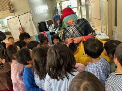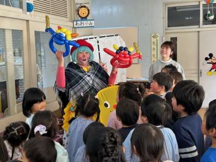 突然、幼稚園にピエロがやってきてくれました。もうすぐ節分ということで、赤鬼と青鬼を持ってきてくれました。子どもたちは大喜びで駆け寄り、大騒ぎでした。住吉幼稚園には赤鬼をプレゼントしてもらいました。青鬼は違う幼稚園に遊びに行くんだって。