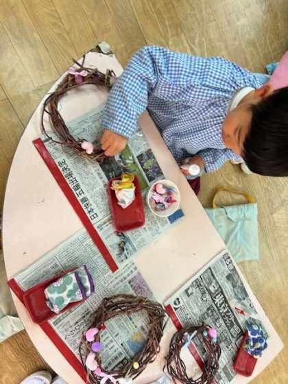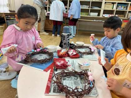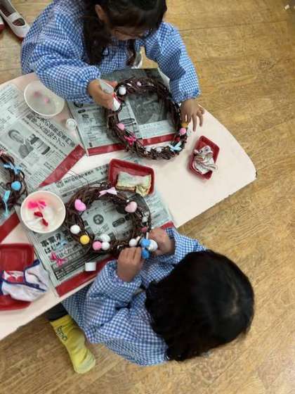 「どんな飾りつけようかな」「「ここにつけようかな」と丁寧に飾りをつけていきました。ボンドの使い方も上手になってきました。