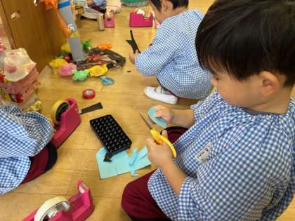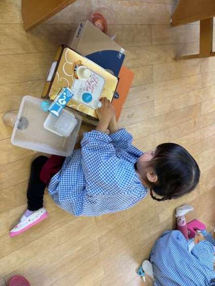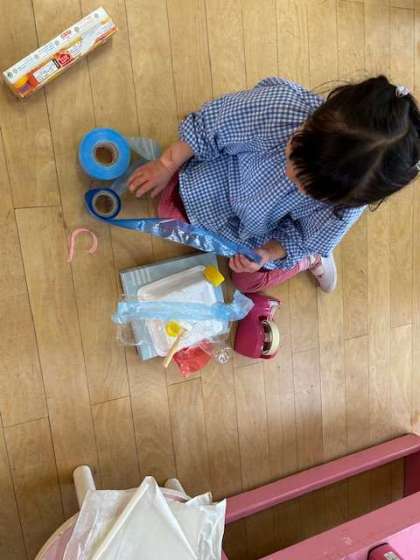 いろいろな素材を組み合わせて、「これはケーキやで」「こんな面白いの見つけてん!」「私幼稚園作ってる。プールもあるで」と試行錯誤しながら製作を楽しんでいます。