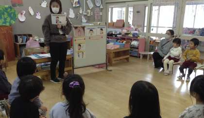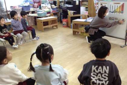 もも組に耳の保健指導をしました。耳を大切にするための4つの約束についてお話ししました。また、大きな音や声が苦手な友達もいることとともに、どの場面でどのくらいの声を出せばいいのかを「こえのおおきさものさし」で知らせました。保健指導の後には、担任の先生が「3番の声でお礼を言いましょう」「忍者で話を聞きましょう」というと、みんなバッチリできていました。