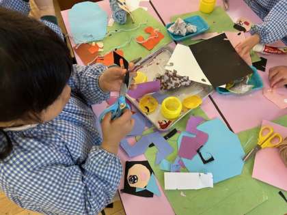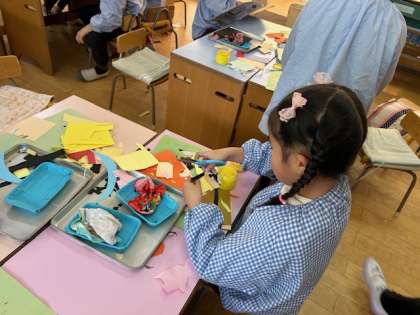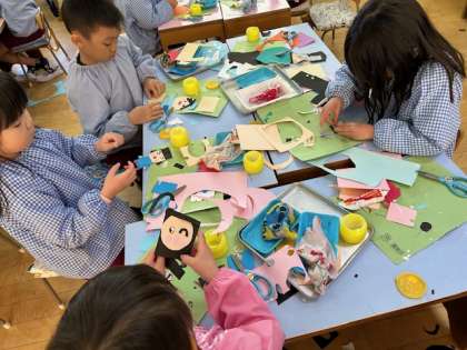 もうすぐ修了を迎え、小学校に行くあお組。細かい製作ができるようになってきて、目や髪の毛、装飾にこだわって、紙を切りながら、丁寧に製作していました。