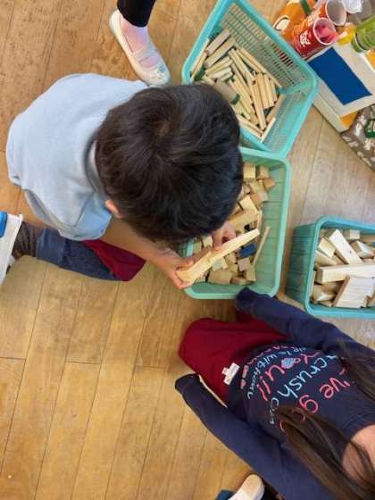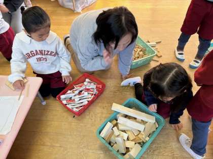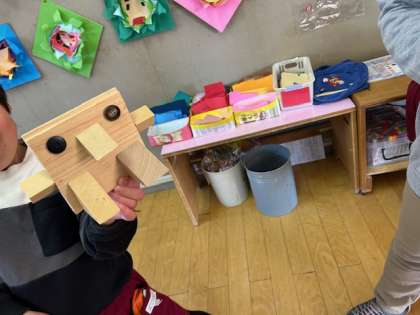 いろいろな形の木切れを覗きこんで、「これにしようかな」「そんなの作ろうかな」「これとこれがいいな。うさぎにしよう」と考えて作っています。友達が作ったものを見て、イメージが広がったり、自分もやってみたいと作っています。