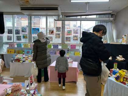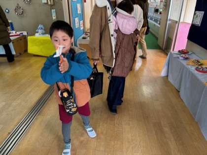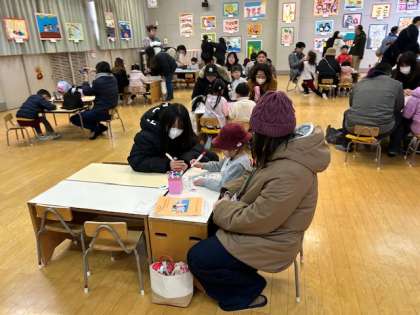 お家の人と一緒に各クラスを見て回ったり、リズム室で絵を見ながら、缶バッジの絵をかいたり、100周年のお祝いメッセージを書いたりして、楽しい時間を過ごしました。