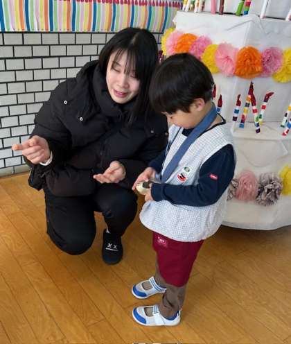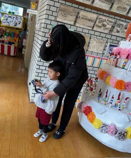園児のおばさんのオリンピック選手の方が、こどもてんらんかいを見に来て、銀メダルを持ってきてくれて見せてもらいました。100周年のお祝いメッセージもいただきました。