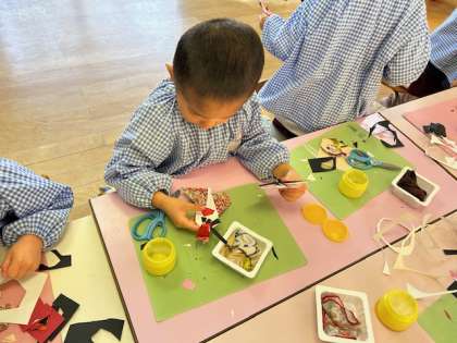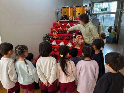 幼稚園に飾ってあるおひなさまを見に行き、着物を着ていることや扇や釈を持っていることを知り、もも組の子どもたちも作ってみました。