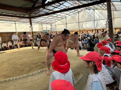 相撲体験をする前に、まずは準備運動をしよう!と朝稽古でされている四股をふんだり、腰を落として開脚したりと一緒に体をほぐしました。