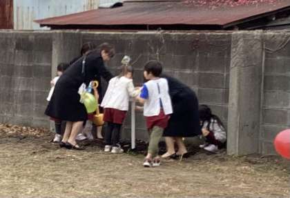 式典の後は園庭で植樹を行いました。ひめりんごの木を園庭に植えました。