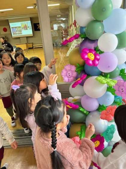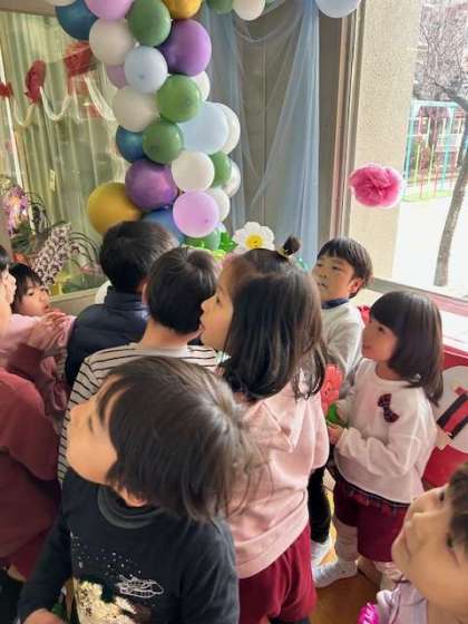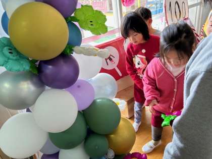 住吉小学校PTA会長さんが、100周年記念のお祝いにと飾ってくださった入り口のアーチのお花を1本ずついただきました。子どもたちは喜んで、好きな色を選んで持って帰りました。