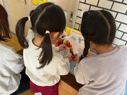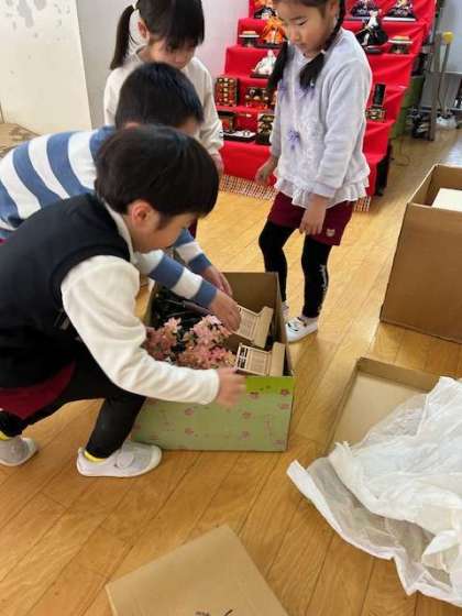 雨でなかなか片付けられなかったひな人形でしたが、やっと晴れたので、片付けました。あお組が一生懸命に、大事に持って、片付けを手伝ってくれました。