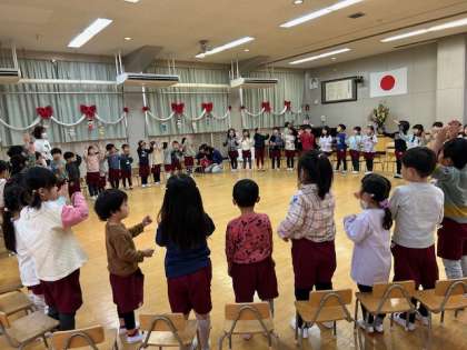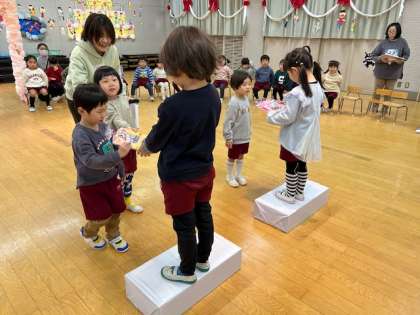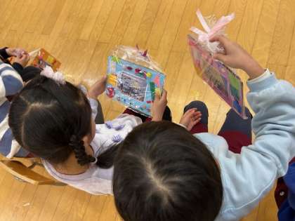 あか組、もも組があお組を迎えて、おわかれ会をしました。思い出や楽しかったことを話したり、お礼を言ったりして、過ごしました。一緒に園外保育に手をつないで行ったり、一緒に遊んだりした友達にフォトフレームを作ってプレゼントしました。