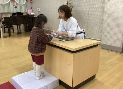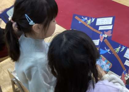 次に、幼稚園でどれくらい大きくなったのかを「せいちょうのきろく」を一人ひとりに渡して知らせました。みんなで見せ合いながら、自分たちが成長したことを喜び、嬉しそうに抱えている子もいました。