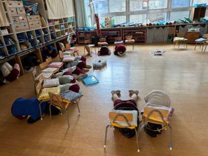 大慌てで頭を守り、机や椅子の下に頭を隠しました。