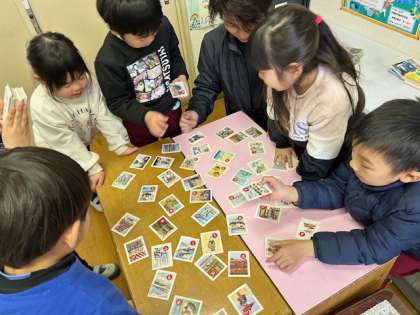 食後は「かるたしよう」と並べて、少し難しい住吉かるたの読み札を読んで、みんなで取りました。「先生、ずるい」と言われながらも、みんな前のめりになって最後まで札を取り続けました。