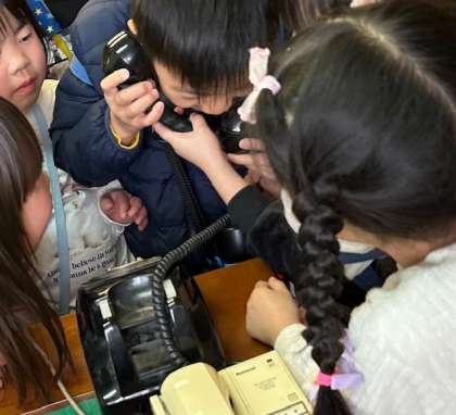 最後は「黒電話のダイヤルを回したい」「かけてみたい、ほんとうかけられるの?」と言っている子どもがいましたが、順番にダイヤルを回し、途中で失敗してはやり直し、「ぴっぴってするのは簡単やな「昔は大変やってんな」と言いながら、受話器の持ち方を悩んでいました。かかった時には「やったー」と大歓声でした。